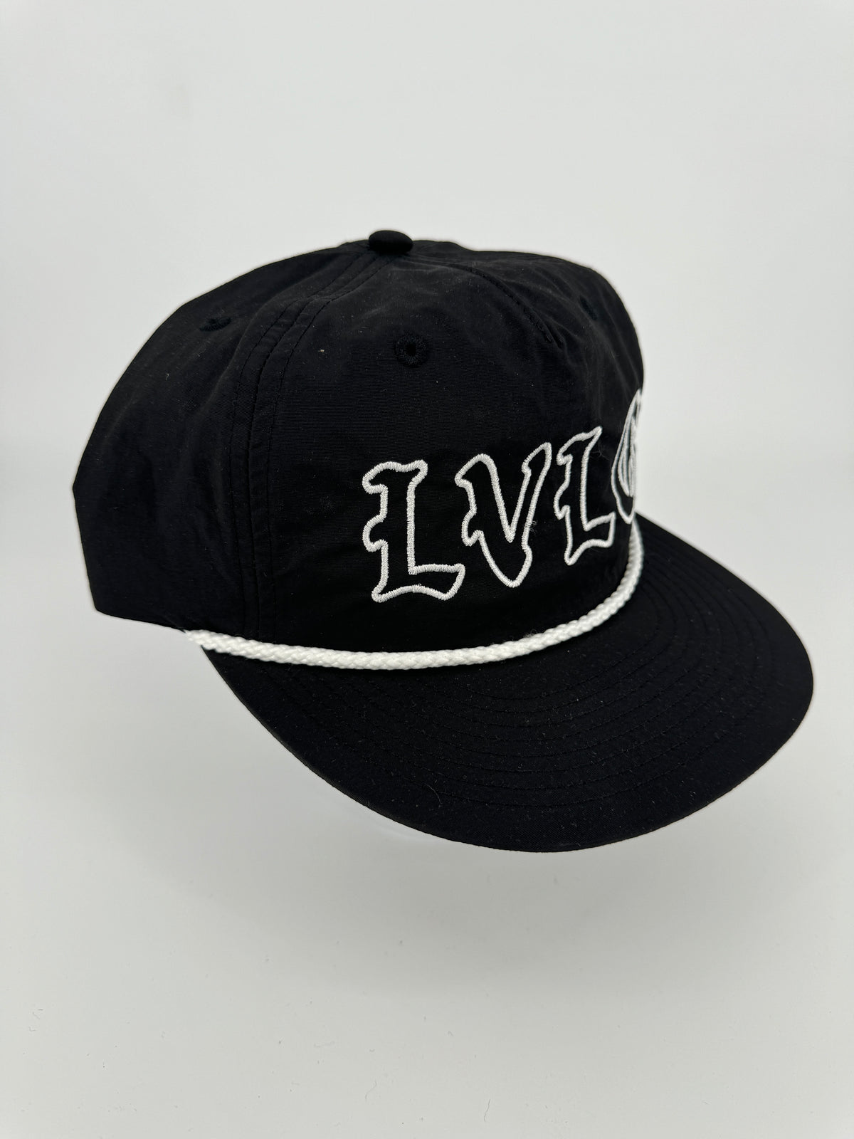 Black Nylon lightweight beach style surf rope hat with white rope and white stitching