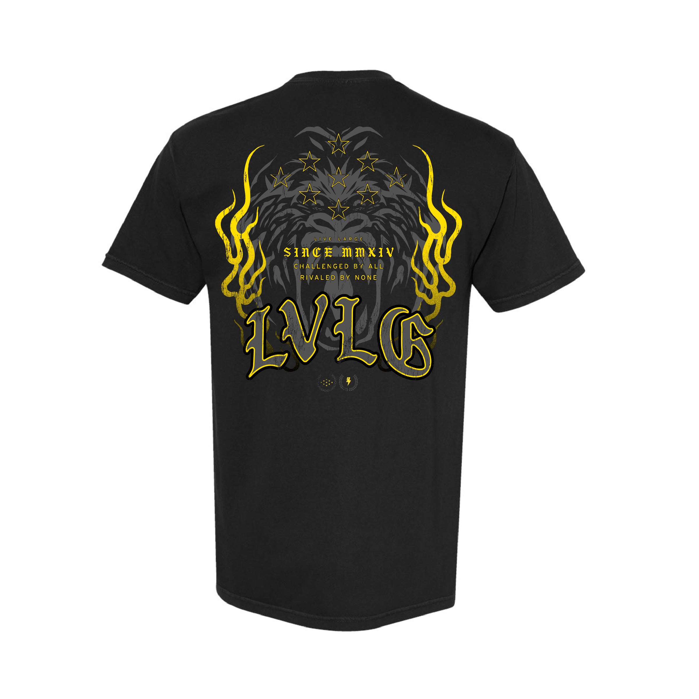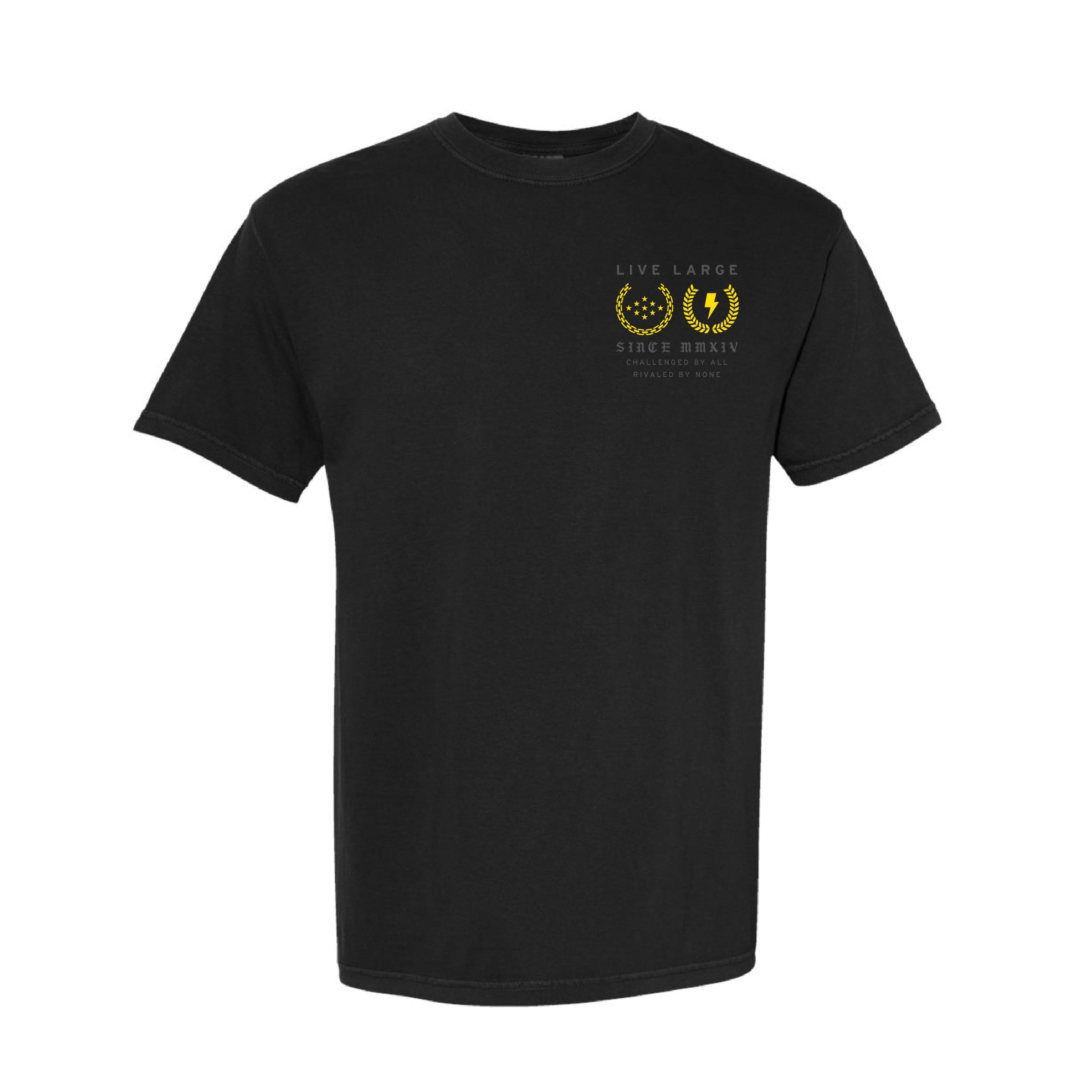 100% Pre Shrunk Cotton, Comfort Colors Tee in black, printed with grey and golden yellow ink. Front left chest, and large back print.