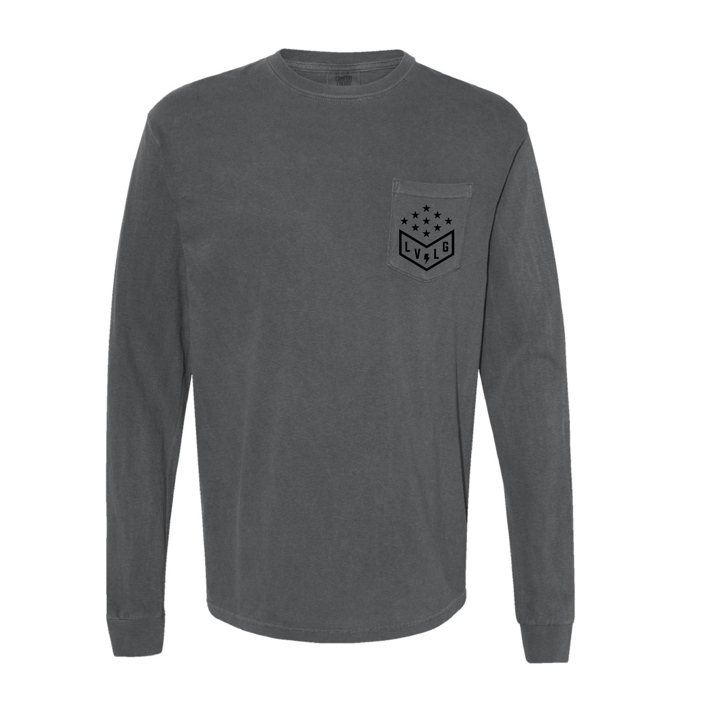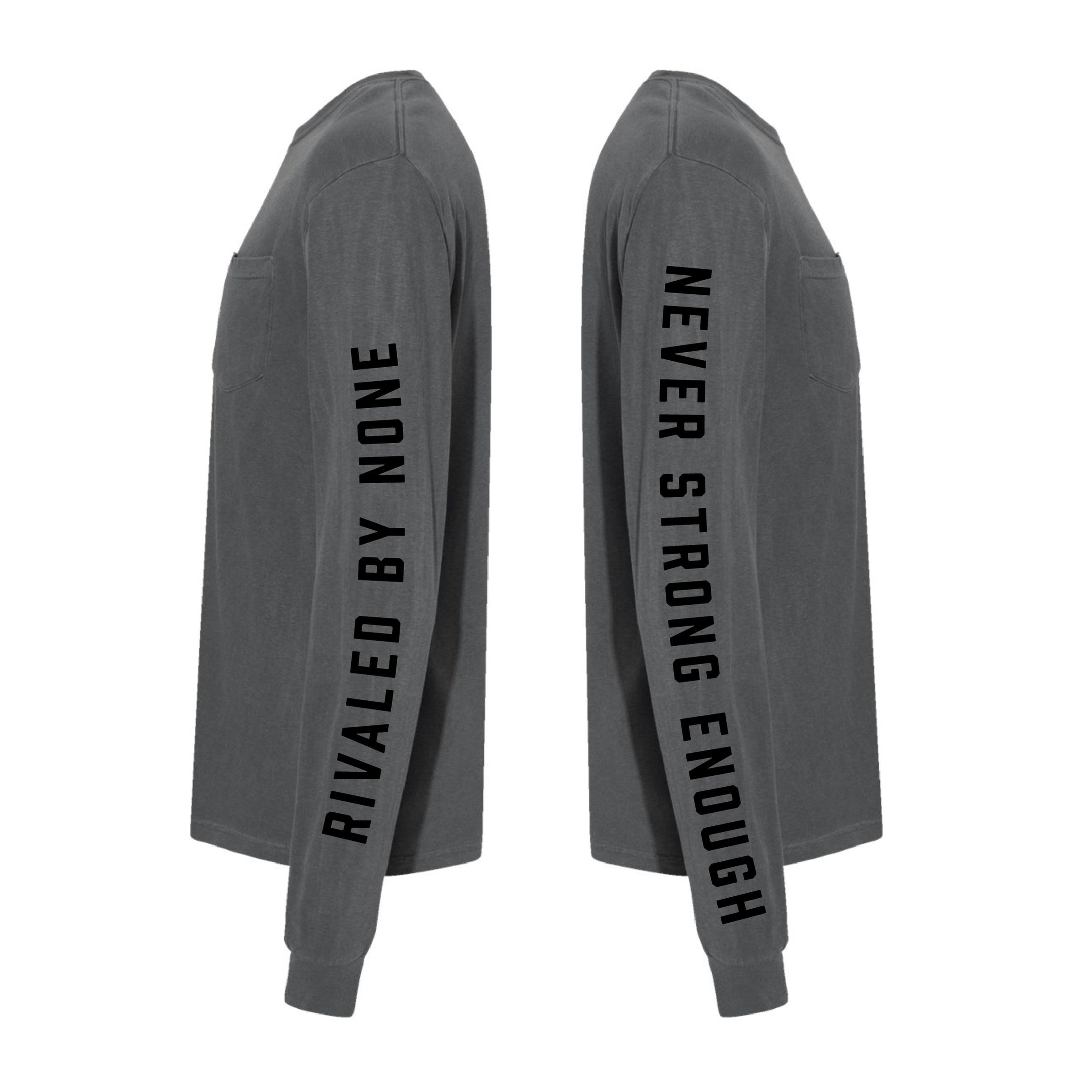 Unisex, Comfort Colors longsleeve in a deep, pepper grey. Printed with Black ink. We went wild with double sleeve prints on this one, and kept the classic chevron logo on the pocket for a clean look.