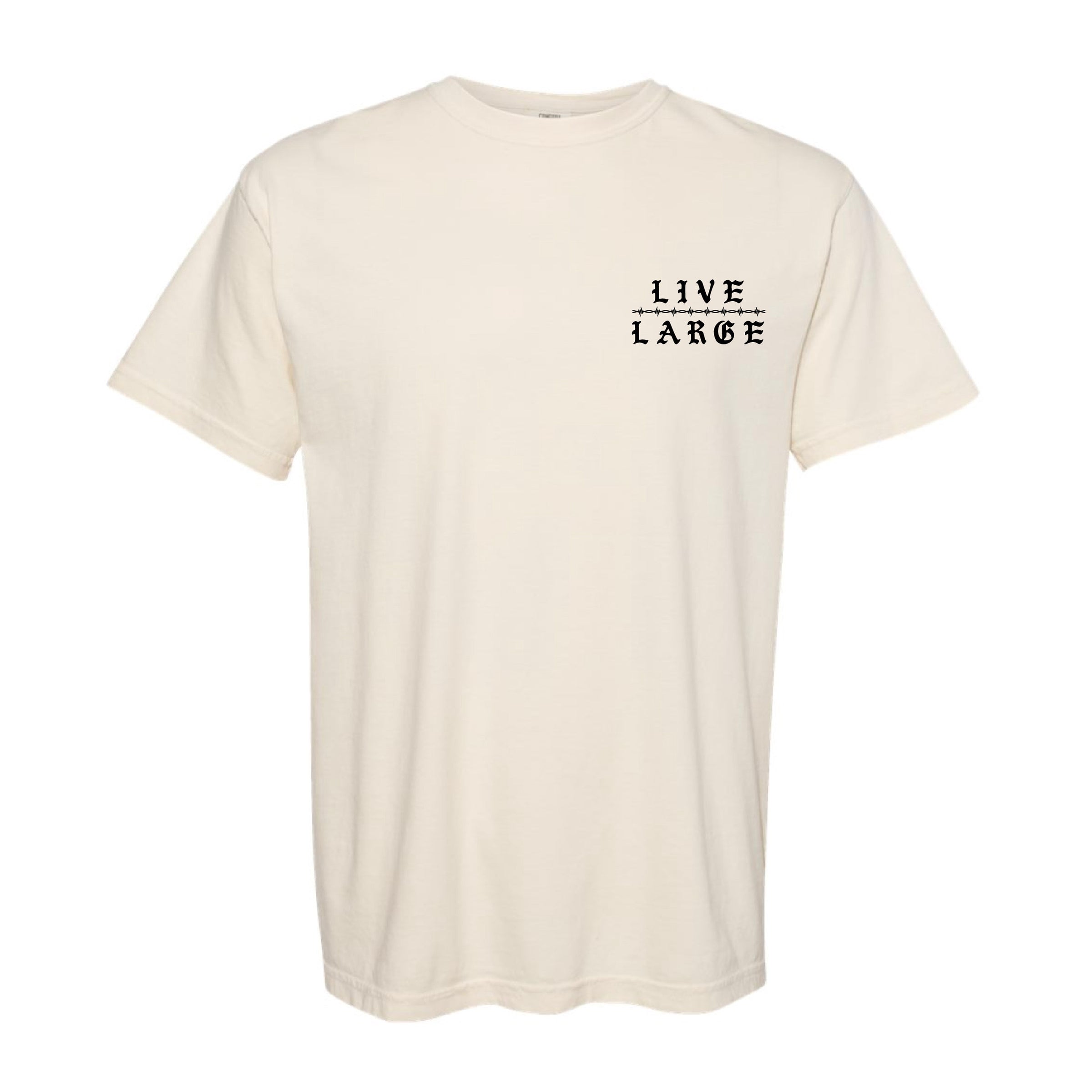 100% Pre Shrunk Cotton, Comfort Colors Tee in black, printed with grey and golden yellow ink. Front left chest, and large back print.